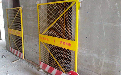 電梯防護(hù)網(wǎng)必須隨層安裝,拆除模板前可采取臨時(shí)防護(hù)(鐵絲固定),待模板拆除后,必須在門洞口結(jié)構(gòu)上打孔安裝12┨的鋼筋,然后將焊制成型的鋼筋防護(hù)網(wǎng)與鋼筋焊牢。